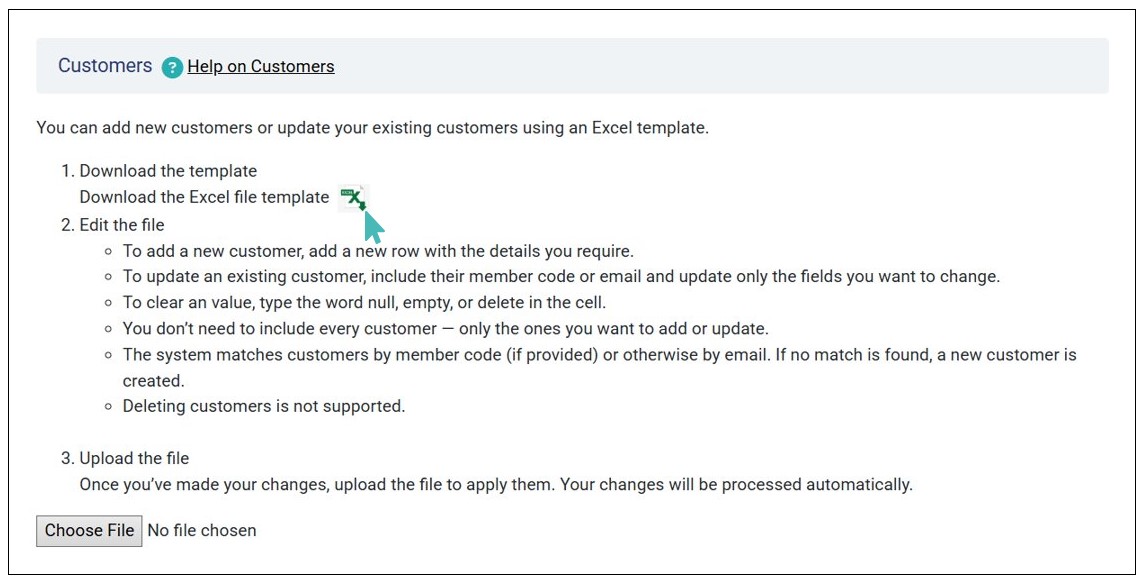Save the changes made on the template and upload the file by clicking Choose File and selecting it. The added/updated customers will appear on your customer list within 15 minutes.