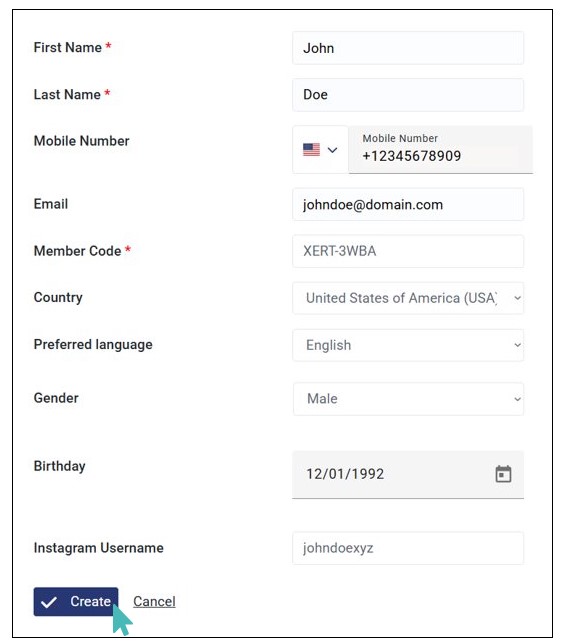 Note that some fields are mandatory and have a specified structure (e.g., phone number must start with a valid country code and email must have a correct structure i.e., xxx@domain.com).