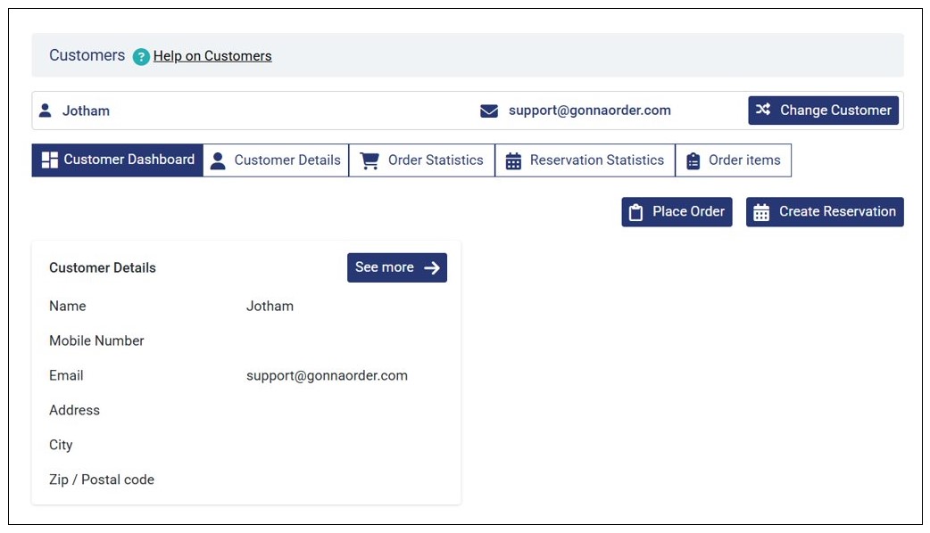 GonnaOrder allows you to view, manage, and update each customer’s information. This ensures you have up-to-date customer information at all times. To access full customer details, go to Customers on the side menu and select the customer you want to view their full information. Next, click the Customer Details tab.