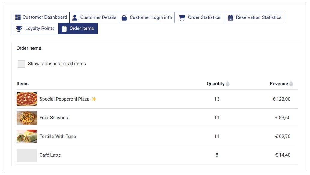 You can opt to view the statistics for only primary items or all items, including options. By clicking the Show statistics for all items, you can see all the menu items that the customer ordered over time, including the options.