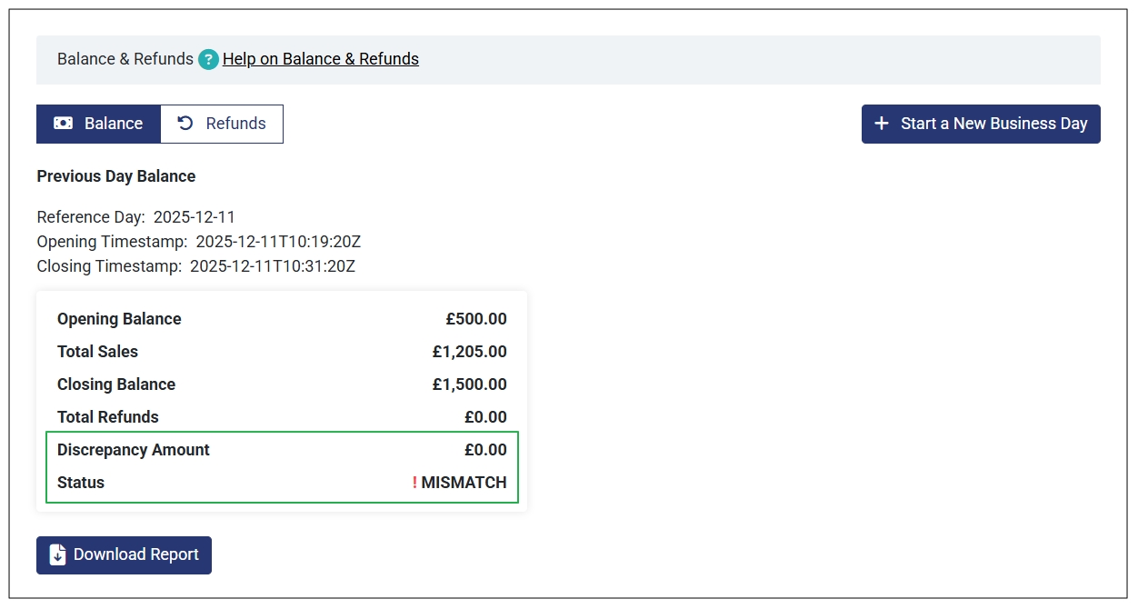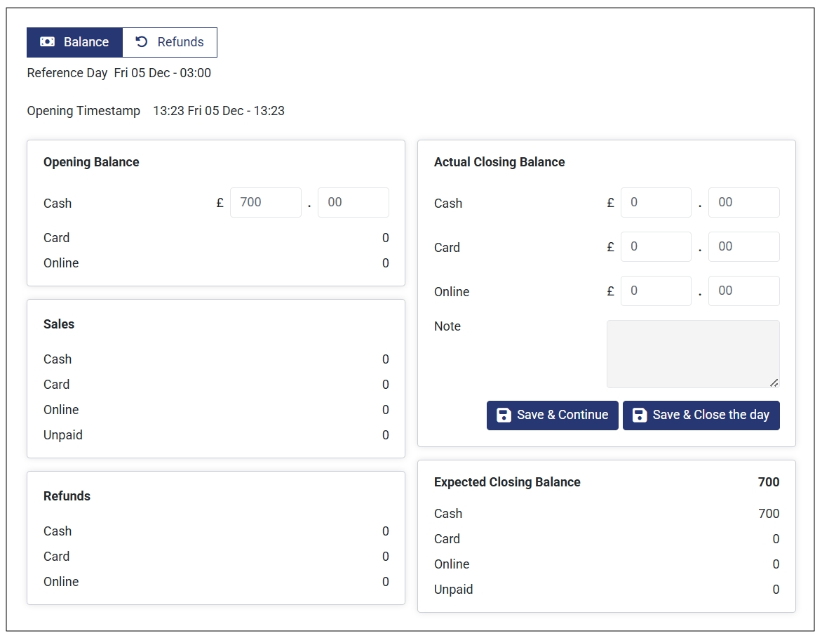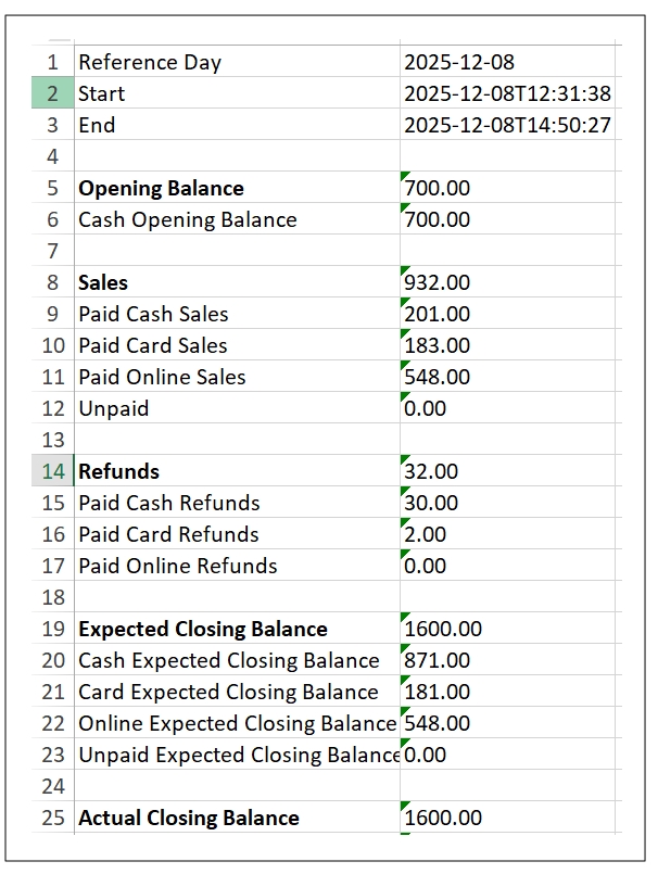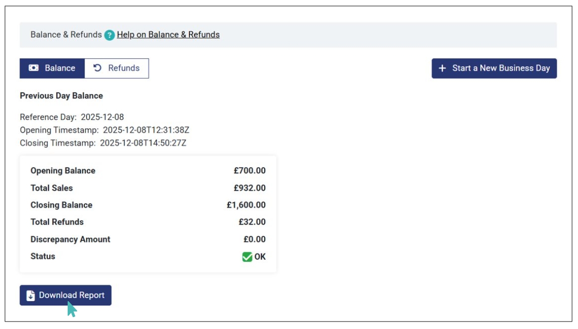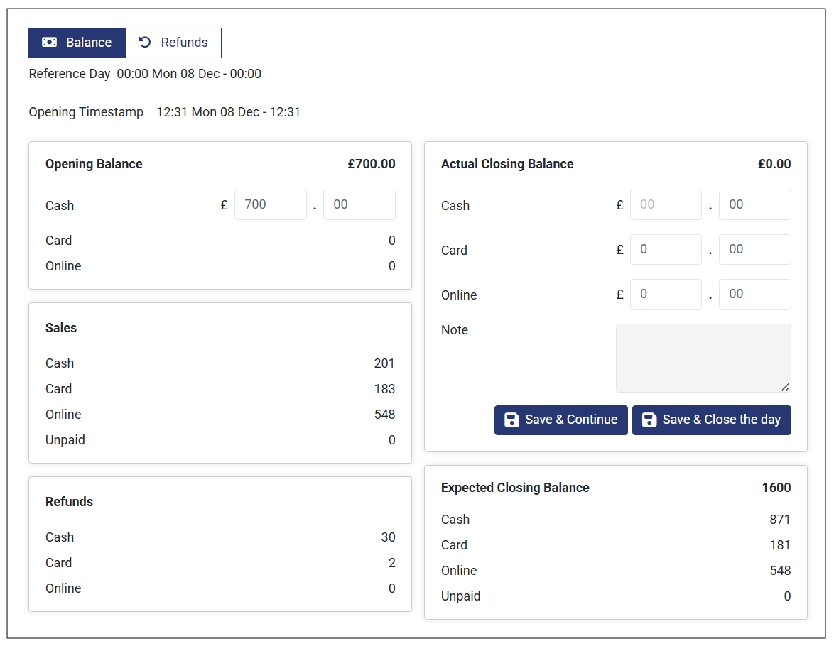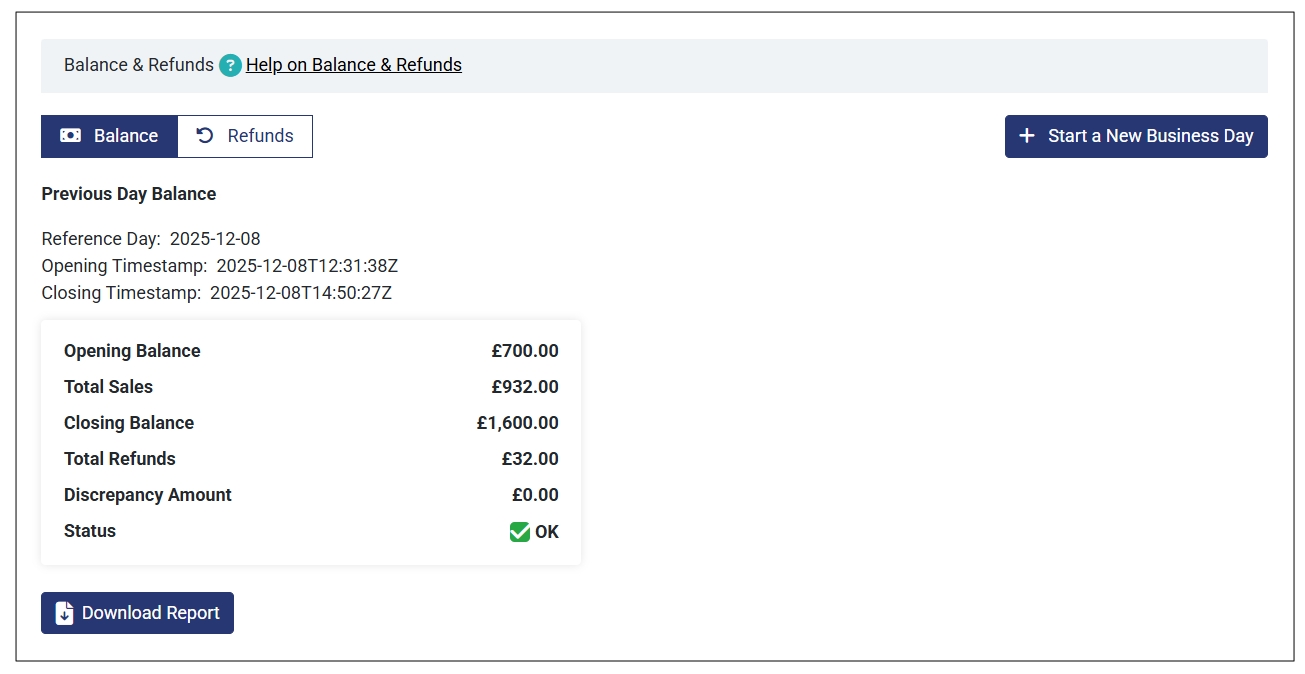 - Closing Balance: The total amount (opening balance + total sales – total refunds) you have at the end of the business