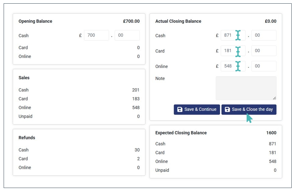 - Verify the actual closing balance in respective fields and click Save & Close the Day. If it’s not at the end of the day or you expect some more orders, you can click Save & Continue.