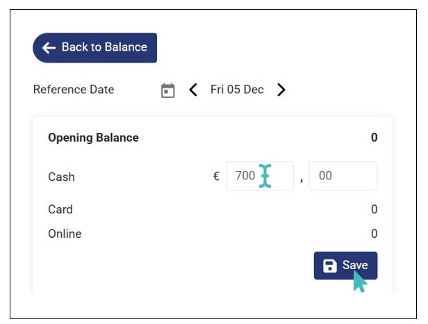 - On clicking Start a New Business Day, input the Opening Balance for the day (usually in cash) and click Save. You are redirected to the balance dashboard where you can view the balances for the new business day.