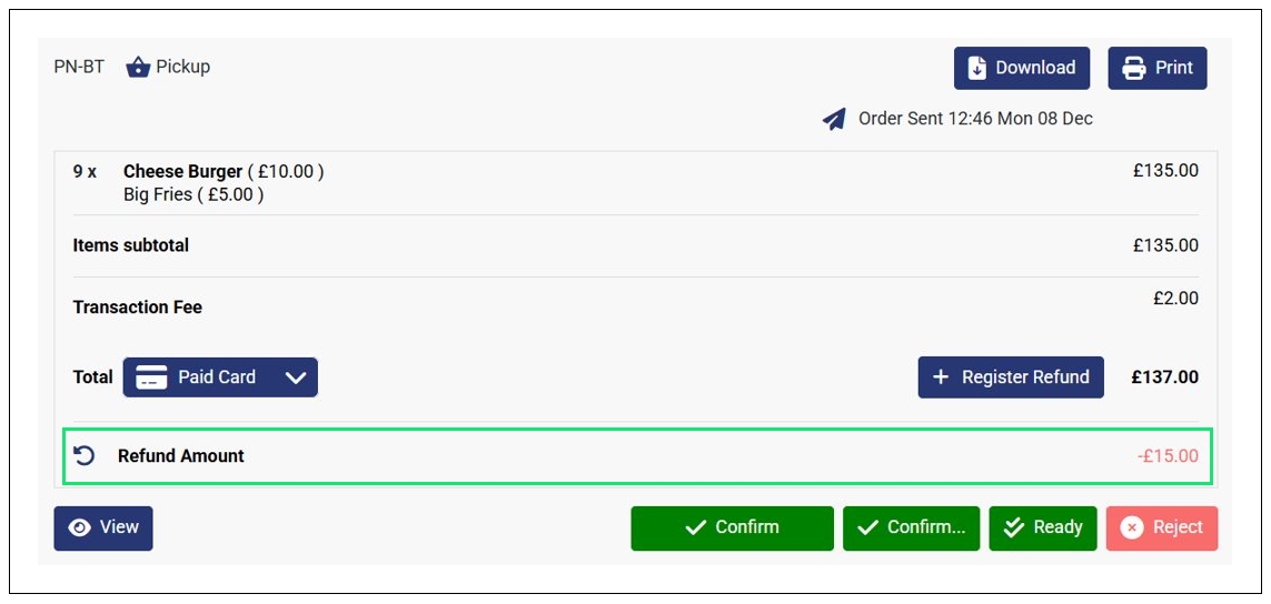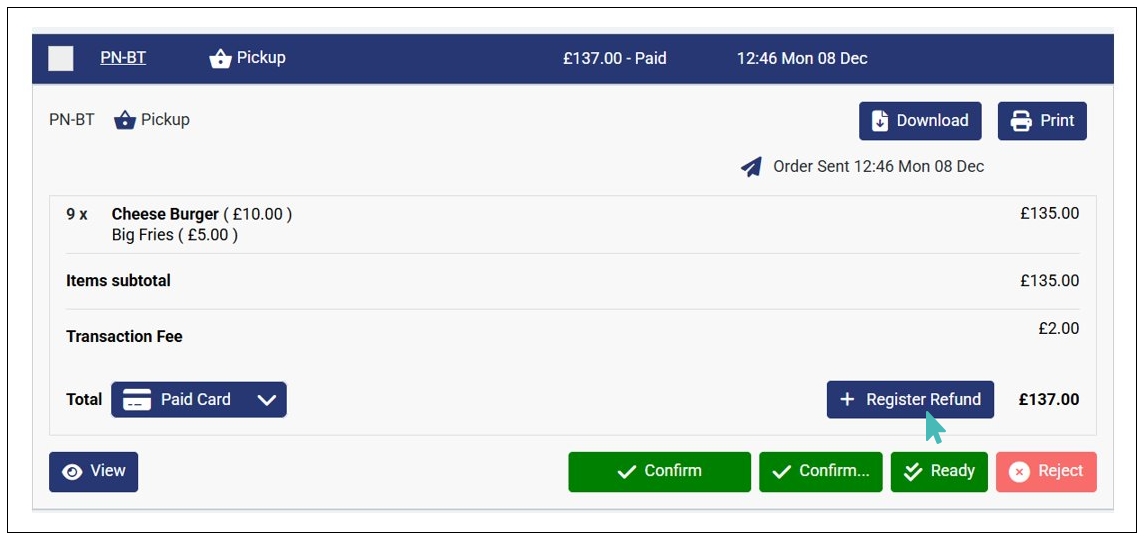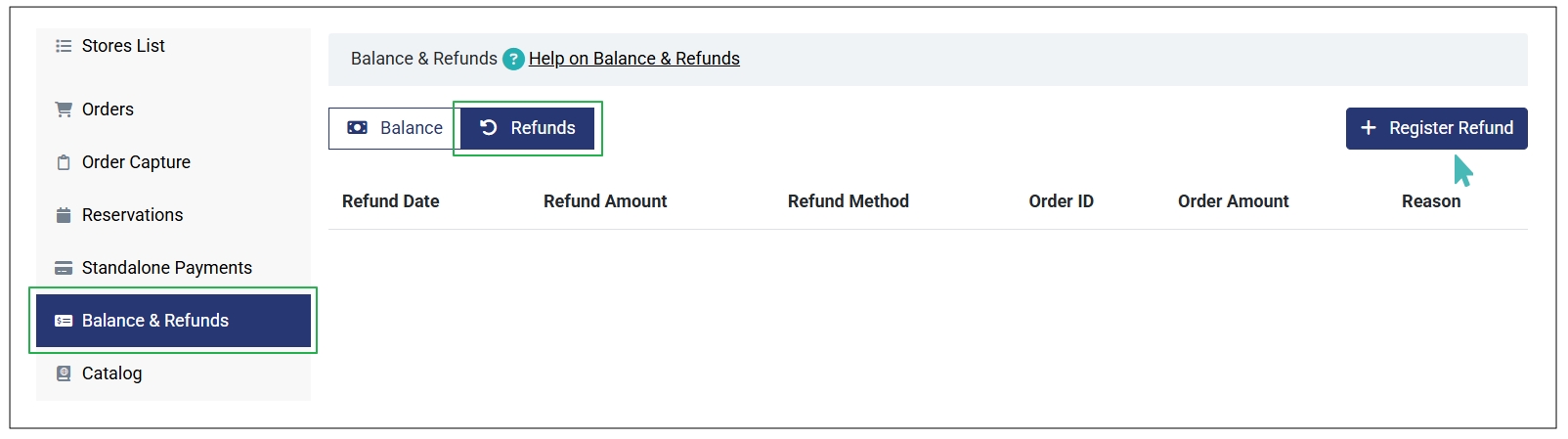 The order must be paid either online, in cash, or via card. Therefore, unpaid orders do not qualify for a refund, and the Register Refund button is not visible on unpaid orders.