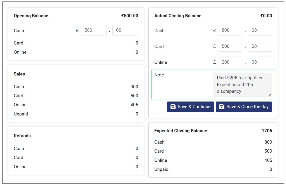 - Add a note on the Actual Closing Balance section with the expected discrepancy amount so that you can easily compare when reviewing the sales report.