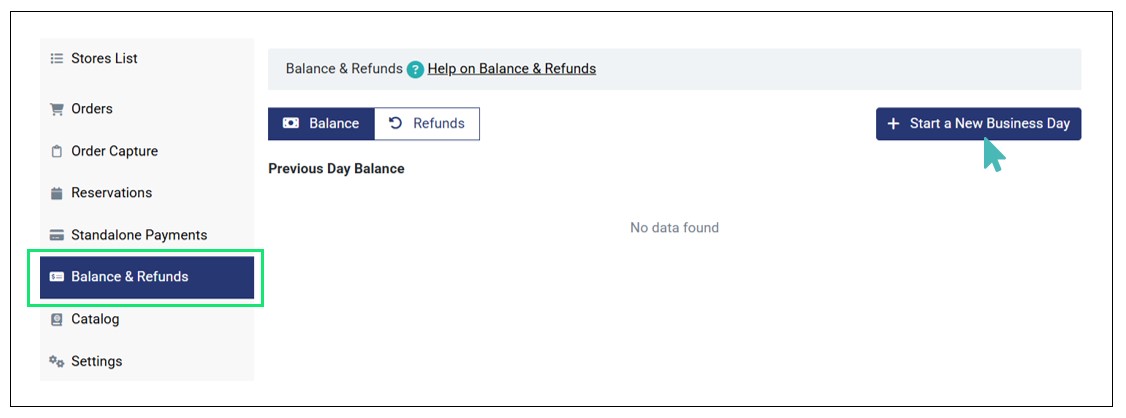 - Click Balance & Refunds on the left pane and then Start a New Business Day. If you had already tracked sales and balances for the previous day, you can see the Previous Day Balance on the Balance tab.