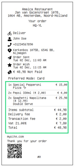 Besides the URL, QR code and slot sequence number, a thank you message will appear on every downloaded order pdf. The slot sequence number and thank you message appear on all orders regardless of the delivery method.