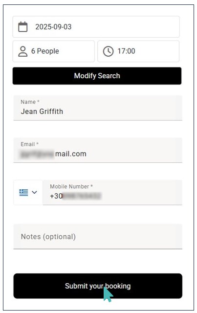 The Submit your booking button will appear on the reservation submission page. Therefore, there will be no payment option for the customer to reserve the table.