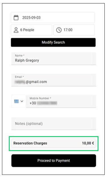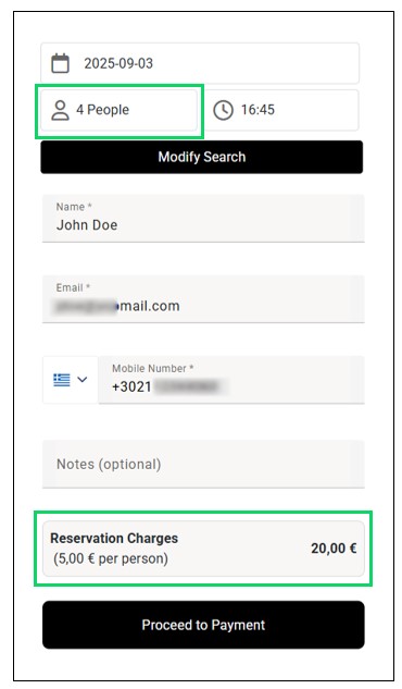 As the name suggests, Per person charges sets reservation charges based on the number of people. Therefore, the charges will vary depending on the number of people you’re reserving a table for. The higher the number of people, the higher the reservation charges. For instance, if the per person charge is €5 and the user selects 4 as the number of people, a total charge of €20 will apply.