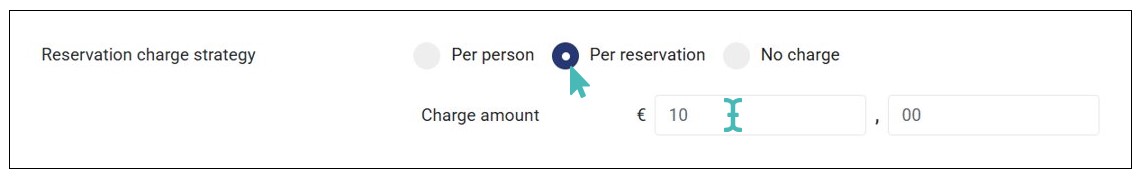 The Per reservation charge applies a constant charge for every reservation, regardless of the number of people. In this case, if you set the per reservation charge at €10, every reservation will be charged €10.