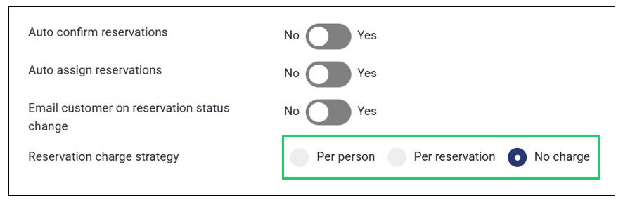 To set your reservation charge strategy, navigate to Settings > Reservations and find Reservation charge strategy.