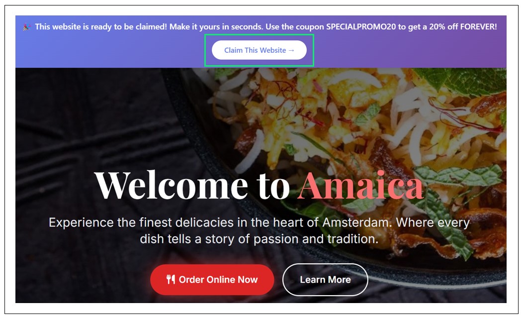 - Next, check the website and see if it matches your desired needs and theme. If it does, click Claim This Website and complete the registration process (if you don’t have a Siteboon account). Use the promo code SPECIALPROMO20 to get a 20% discount on Siteboon to maintain your website.