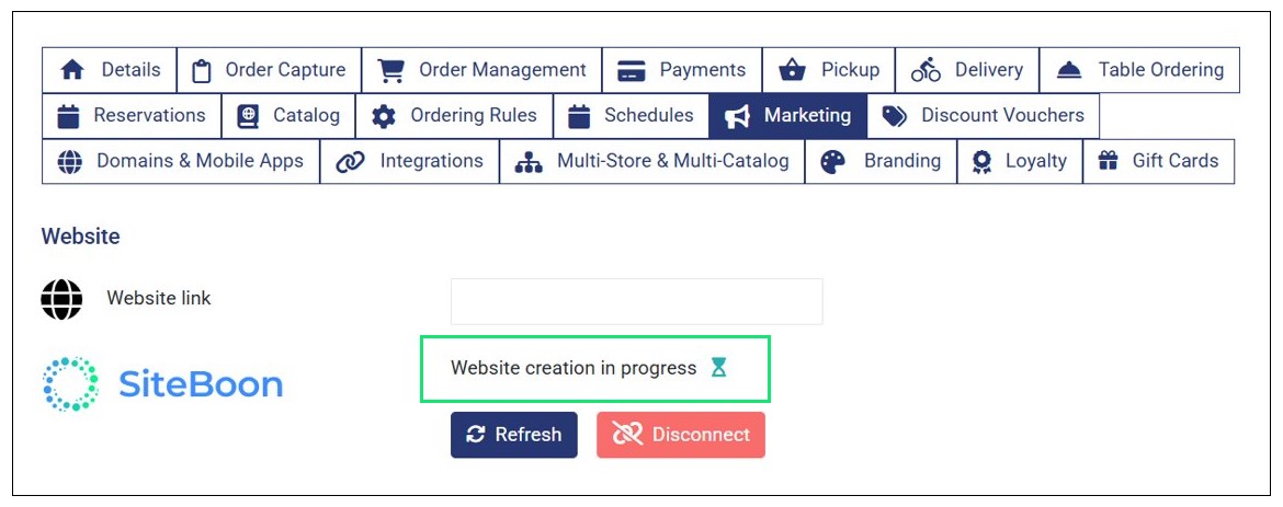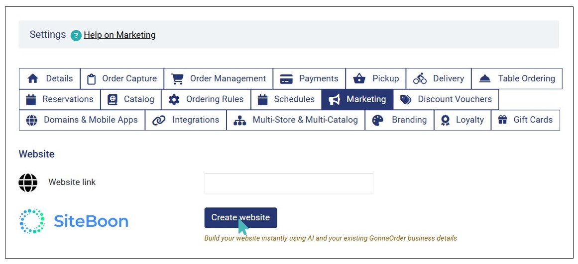 To add your website link, input the link on the Website link field under the Marketing settings. Here you can input the link to your customer menu/ordering page. Alternatively, you can add the link to your business website (manually created or one generated via Siteboon). See more on creating your business website with Siteboon.