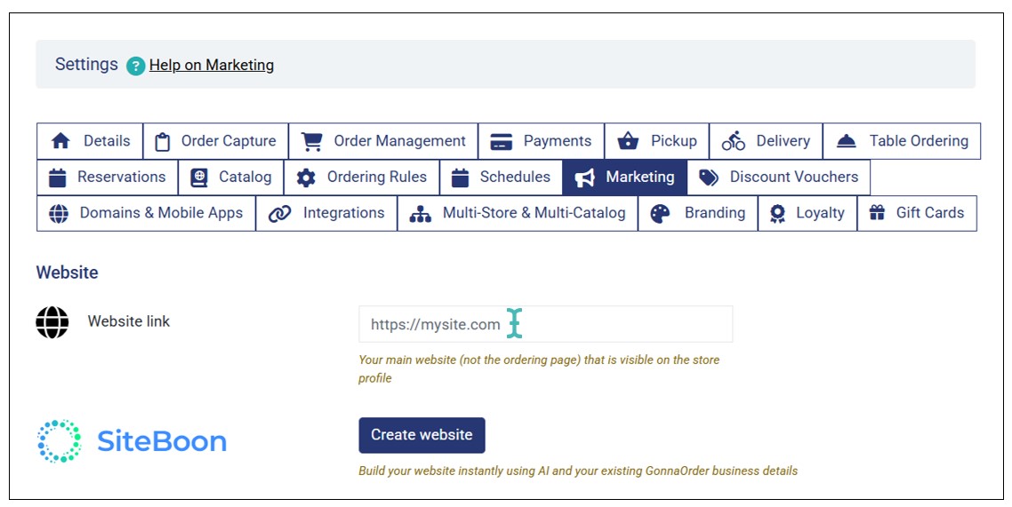 To add your business website link, input the link on the Website link field under the Marketing settings. Here, you can add the link to your business website (manually created or one generated using Siteboon). See more on creating your business website with Siteboon.