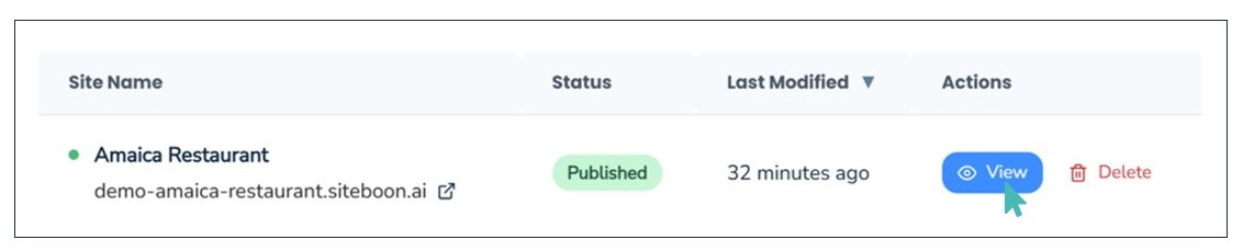 - Login to your Siteboon account and click View on the website you would like to edit.