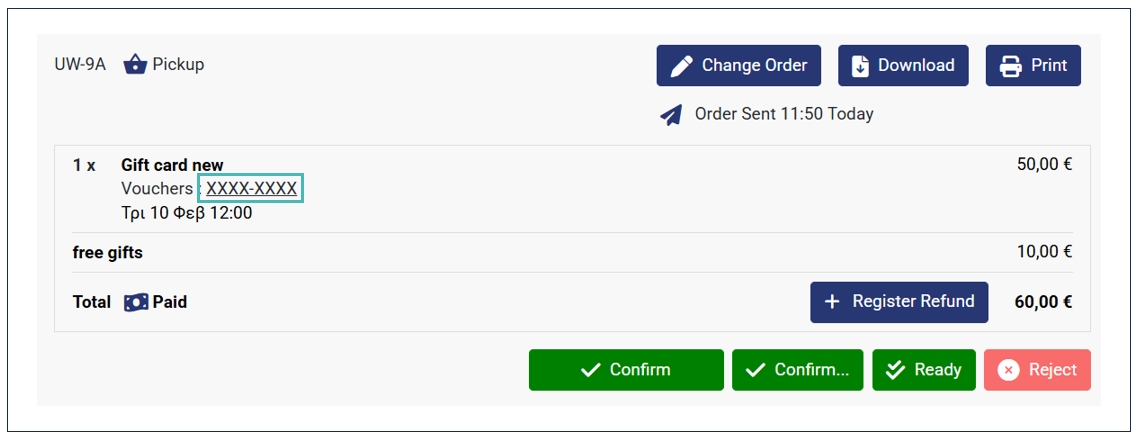 Upon applying the gift card voucher code on an order and submitting it, the order will be marked as paid on the orders dashboard.