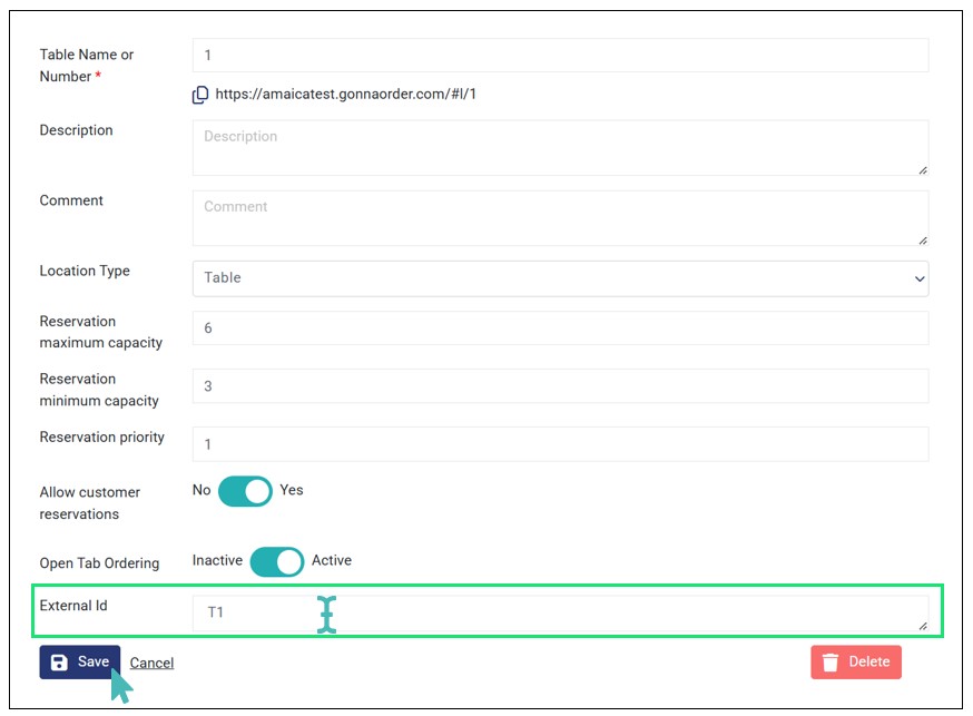 - Copy the table name from the plan and paste it on the External Id field of the desired table on your GonnaOrder store. We recommend using related table names on both Epos Now and your GonnaOrder store. For instance, you can associate the table T1 on Epos Now with Table 1 on your GonnaOrder store.