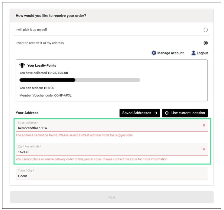 - If the customer has already chose their preferred delivery mode on the delivery/pickup child store selection, they will not be asked again on the checkout page. However, they can change their delivery address, which can lead to them being served by a different child store.