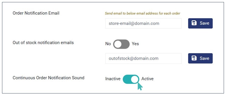 Find Continuous Order Notification Sound and toggle the button to Active to activate. You will now hear a continuous bell sound every time there is a new order in your store. The sound will stop playing when you open the newest order in your store dashboard.