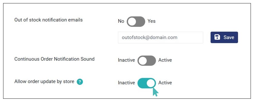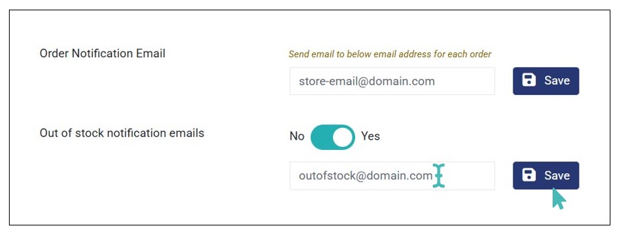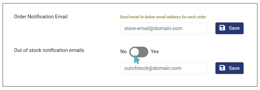 With the said settings activated, it’s time to enable Out of stock notification emails. To do so, go to Settings > Order Management and toggle the Out of stock notification emails button to Yes. Next, enter the email you want to receive out-of-stock emails and click Save.