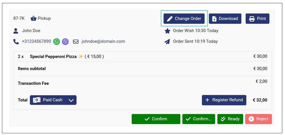When you Allow order update by store, a new Change Order button appears on the order details page.