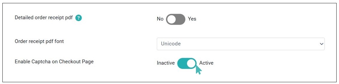 You can switch the toggle to Inactive to stop captcha verification at checkout when submitting unpaid orders. Note that the captcha verification only applies when submitting an unpaid order – the verification doesn’t happen when a customer proceeds to pay online for their order.