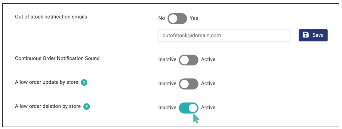 - Scroll down to find Allow order deletion by store and toggle the button to Active.