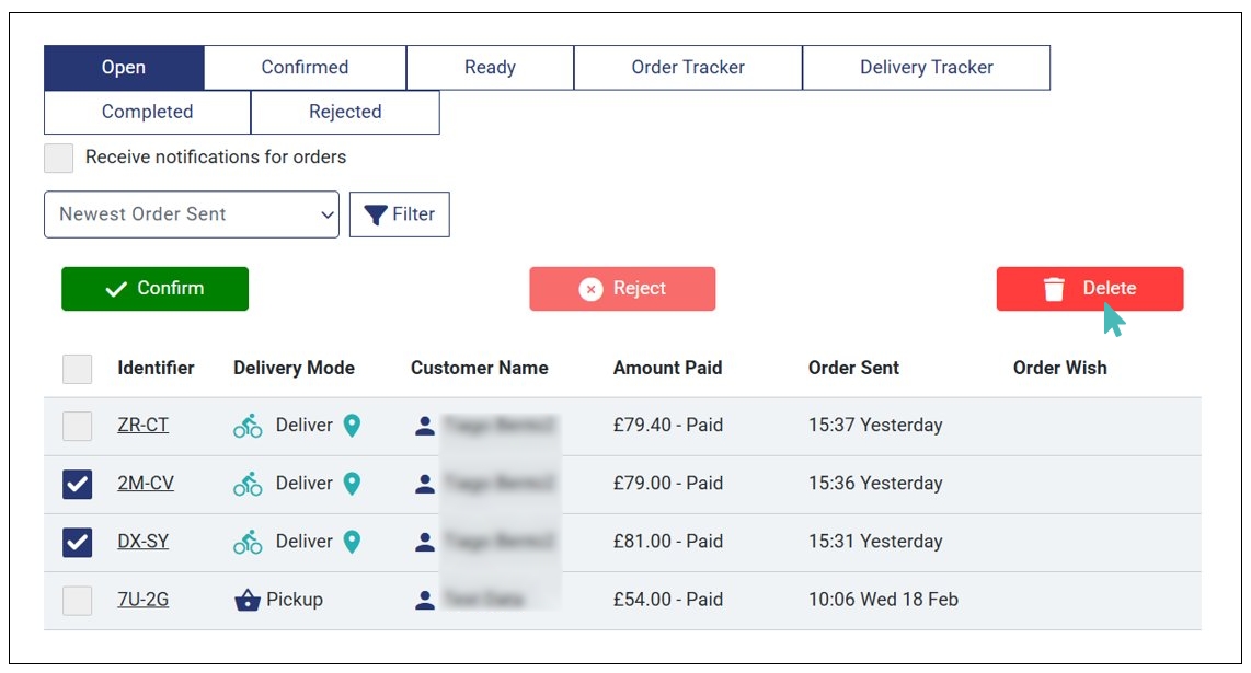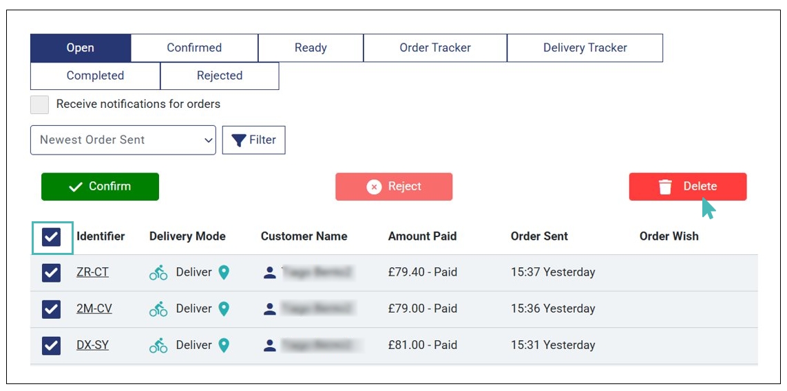 When you activate order deletion by store, you can delete orders in all tabs (i.e., Open, Confirmed, Ready, Rejected and Completed) in the orders dashboard. You can delete a single or multiple orders in bulk by selecting the orders and clicking Delete.
