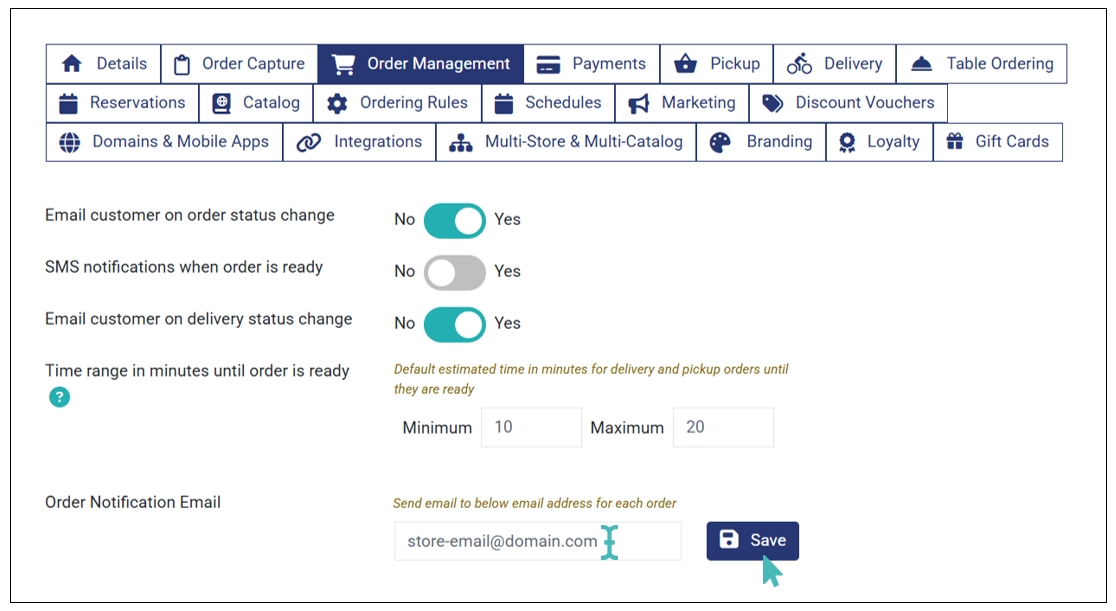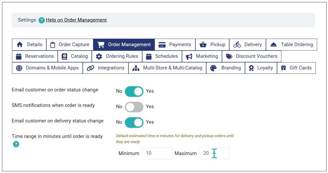 The Order Management tab under Settings is where store managers can configure emails, order processing times, notifications, accept, delete or update order settings.