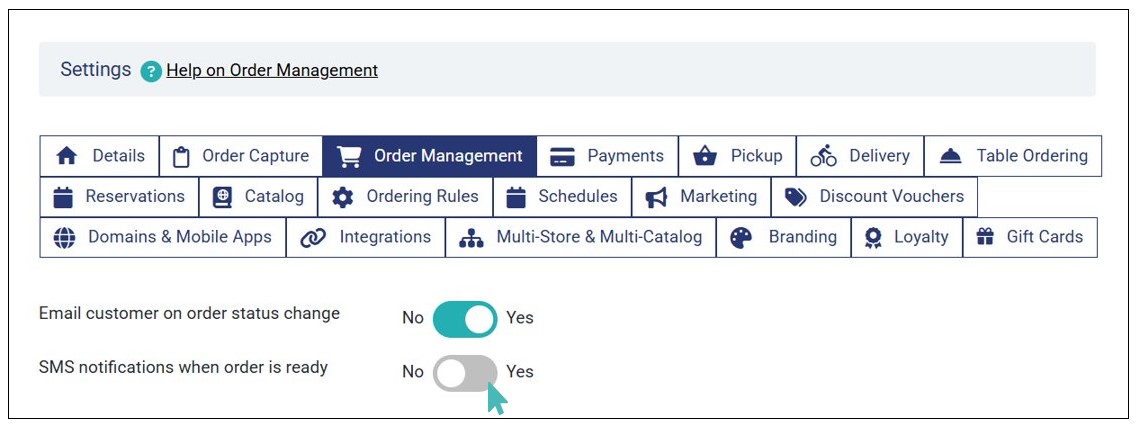 This setting is available under Settings > Order Management > SMS notifications when order is ready . To enable it, toggle the button to Yes.