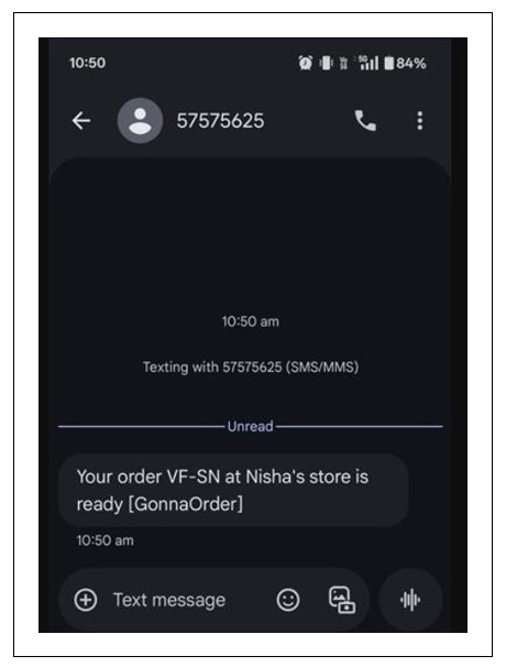 - Customers receive the SMS notification on the phone number they included when submitting their order.