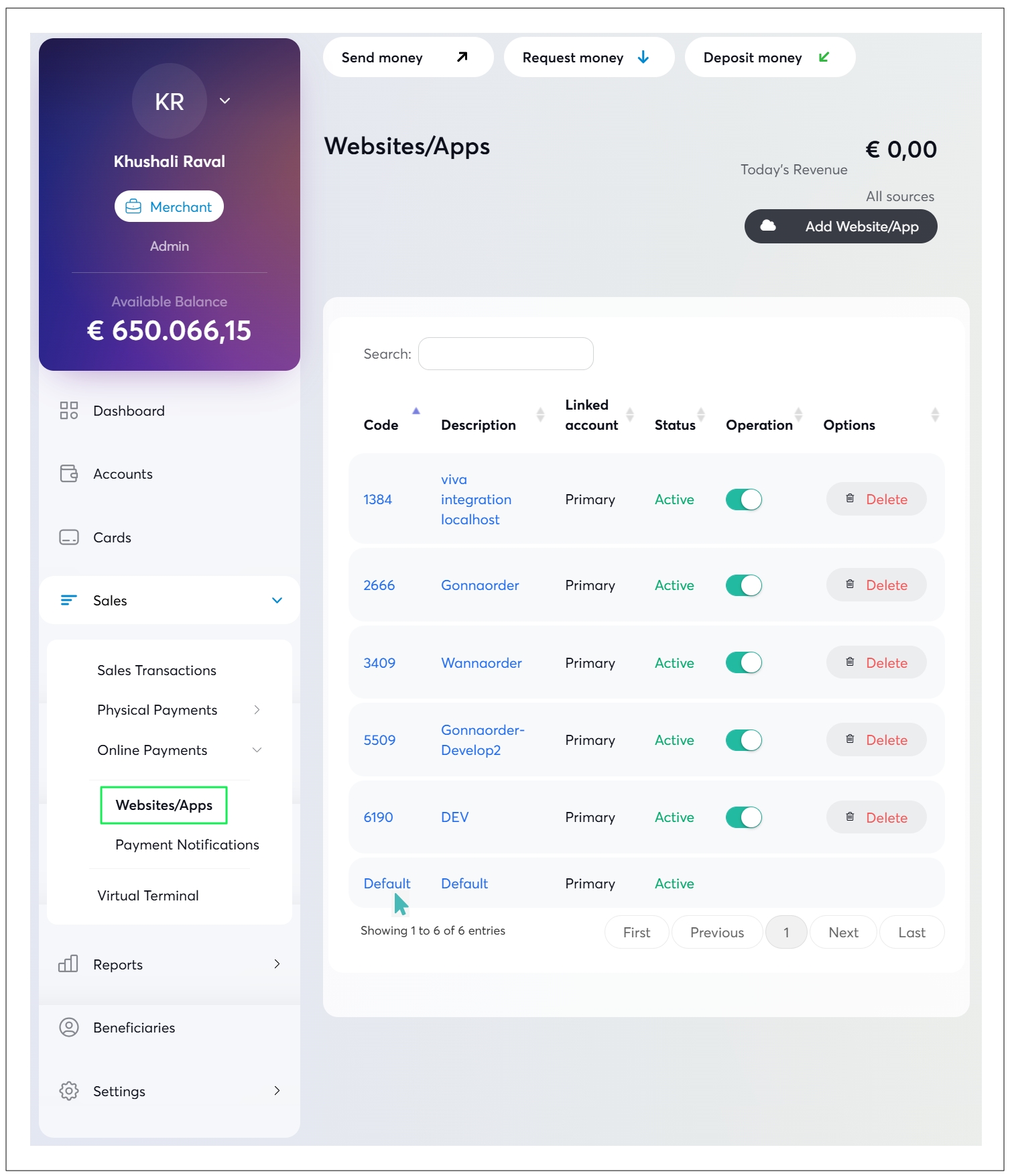 - From the menu on the left, click on Sales > Online Payments > Website/Apps.