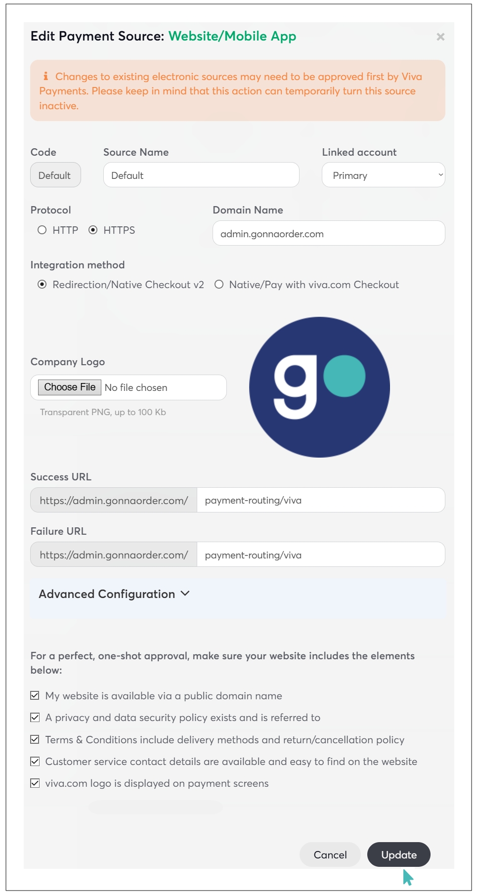 Lastly, add a logo that will be displayed to customers on the payment page. We recommend that you use your store logo as this is more friendly and familiar to your customers. If you do not have a logo yet, use the GonnaOrder logo or skip it. The Viva logo will be used on the payment page if you do not upload a file.