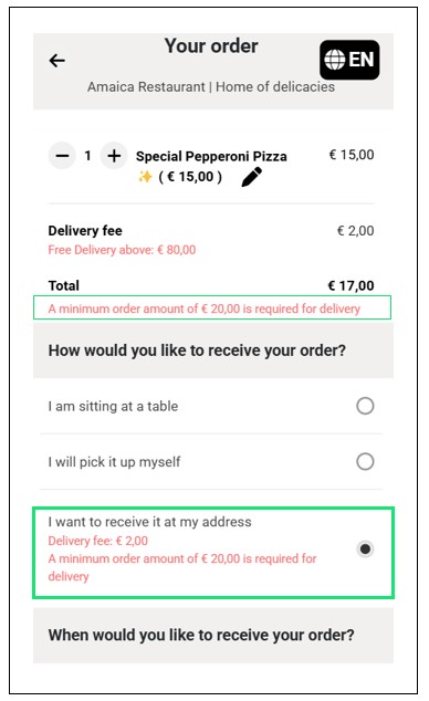 If the total order amount is below €20,00, the user will not be allowed to continue the order. GonnaOrder will disable the delivery option for orders below the minimum delivery order amount and notify the customer that there is a set minimum order amount for delivery.